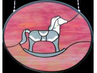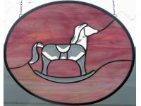 | Childs Rocking Horse bevel set surrounded by pink opalescent glass |