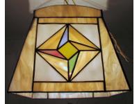 Each of the four sides has a different quilters panel. The same light shades of blue, green, pink and coral are used in all panels of this lamp. Complete with swag hardware